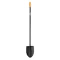 Fiskars Long Handle Steel Digging Shovel (96685935J) features: Long steel handle provides extra reach and leverage for deep digging., Heat-treated steel blade with a round point for efficient soil penetration., Welded socket and corrosion-resistant finish for long-term durability..